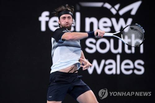 epa09680159 Nikoloz Basilashvili of Georgia in action during his Round of 16 match against Andy Murray of Britain on Day 3 of the Sydney Tennis Classic at Sydney Olympic Park in Sydney, Australia, 12 January 2022. EPA/DAN HIMBRECHTS AUSTRALIA AND NEW ZEALAND OUT