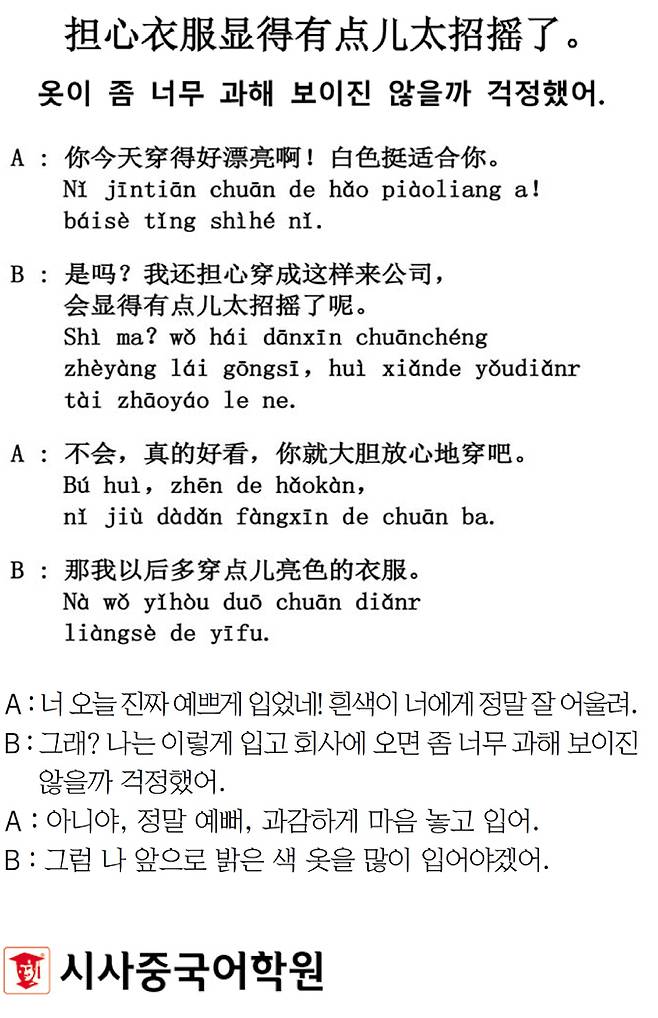 [시사중국어학원의 리얼 중국어 회화] 옷이 좀 너무 과해 보이진 않을까 걱정했어.
