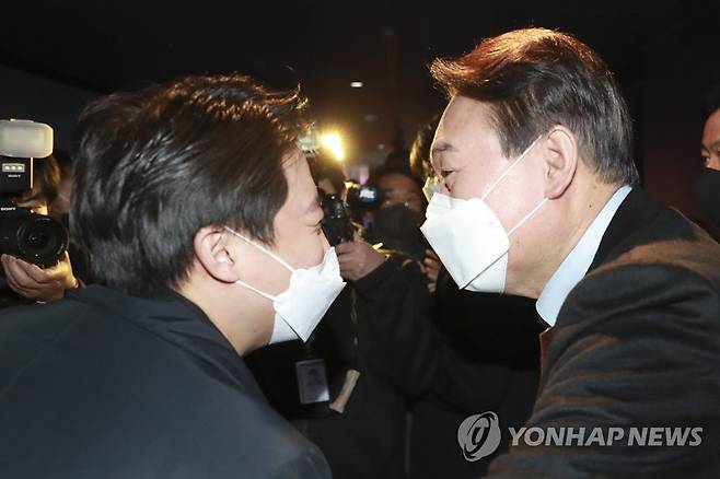 (서울=연합뉴스) 국민의힘 윤석열 대선 후보와 이준석 대표가 12일 서울시 종로구 그랑서울 타워1에서 온라인 게임 '리그오브레전드' 대회인 2022 LCK 스프링 개막전 관전을 앞두고 인사하고 있다. 2022.1.12 [국회사진기자단]