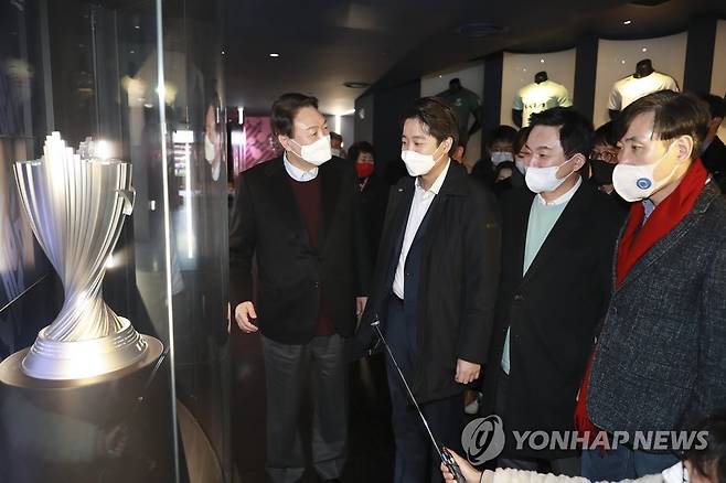 (서울=연합뉴스) 국민의힘 윤석열 대선 후보와 이준석 대표가 12일 서울시 종로구 그랑서울 타워1에서 온라인 게임 '리그오브레전드' 대회인 2022 LCK 스프링 개막전 관전을 앞두고 로비에 전시되어 있는 트로피 앞에서 대화를 나누고 있다. 왼쪽부터 윤 대선후보, 이 대표, 원희룡 정책본부장, 하태경 게임특별위원장. 2022.1.12 [국회사진기자단]