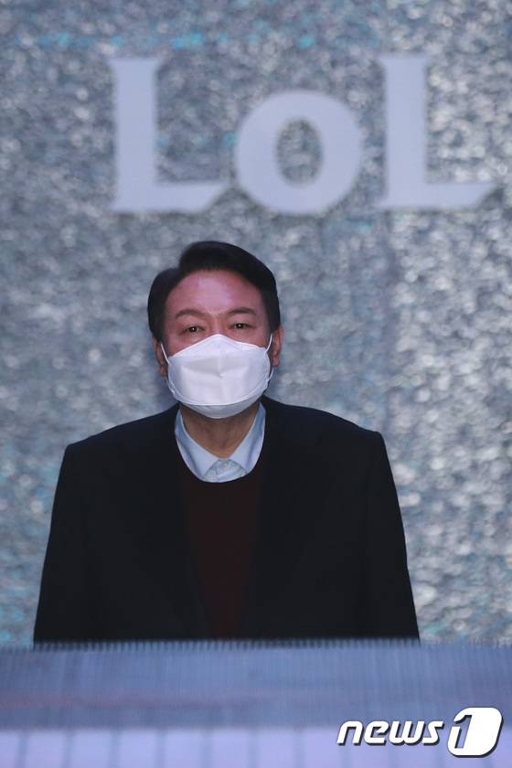 (서울=뉴스1) 국회사진취재단 = 윤석열 국민의힘 대선 후보가 12일 서울 종로구 그랑서울타워에서 열린 온라인게임 '리그오브레전드 챔피언스 코리아(LCK) 2022 스프링' 개막전을 관전하기 위해 입장하고 있다. 2022.1.12/뉴스1