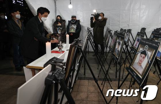 (서울=뉴스1) 안은나 기자 = 이준석 국민의힘 대표가 12일 오후 서울 중구 청계광장에서 코로나19 백신 피해자 가족협의회가 마련한 희생자 분향소를 찾아 조문하고 있다. 2022.1.12/뉴스1