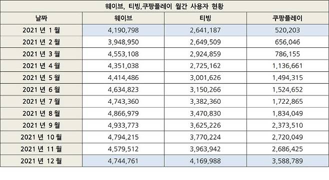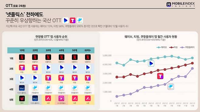 12일 모바일 빅데이터 플랫폼 기업 아이지에이웍스에 따르면 국내 유료 구독형 OTT 업종에서는 '넷플릭스'가 꾸준히 업계 1위를 유지하는 가운데, 지난해 주요 국산 OTT 앱 사용자는 각각 웨이브 13%, 티빙 58%, 쿠팡플레이 590% 증가(1월 대비 12월 사용자 수)한 것으로 나타났다.