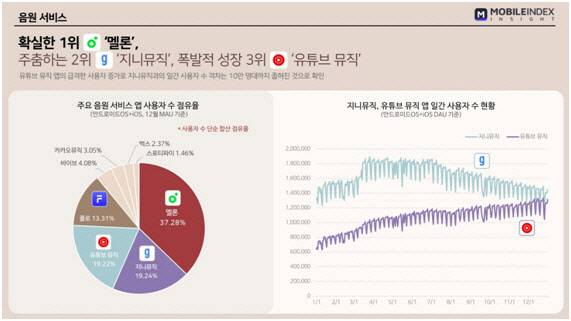 영화관 앱 사용자 수는 대작 개봉에 따라 소폭 상승하고 있으며, 음원 서비스 앱 업종에서는 확실한 1위로 ‘멜론’이 자리 잡은 가운데, 업계 3위 ‘유튜브 뮤직’의 성장세가 두드러졌다.