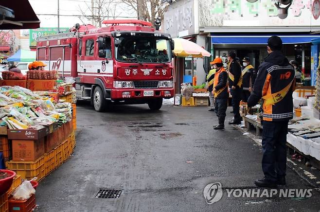 (광주=연합뉴스) 12일 광주 광산구 송정매일시장에서 소방대원, 의용소방대원, 자율소방대원 등이 소방차 길 터주기 운동에 참여하고 있다. 광주 광산소방서는 '안전하기 좋은 날' 캠페인 진행일에 맞춰 전통시장에서 화재 예방 활동을 펼쳤다. 2022.1.12 [광주 광산소방서 제공. 재판매 및 DB 금지]