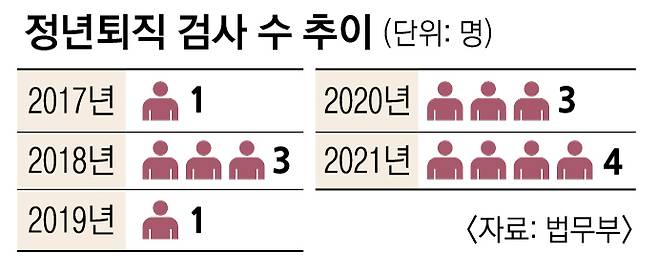 12일 서울신문 취재를 종합하면 지난해 전국 검찰청에서 정년퇴직한 검사는 모두 4명이다. 이전까지는 연간 3명(2018년·2020년)이 가장 많았는데 이를 뛰어 넘은 것이다.