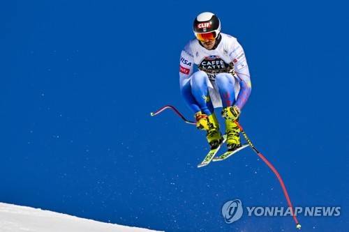 epa09680395 Bryce Bennett of the United States in action during a training session of the men's downhill race at the Alpine Skiing FIS Ski World Cup event in Wengen, Switzerland, 12 January 2022. EPA/JEAN-CHRISTOPHE BOTT