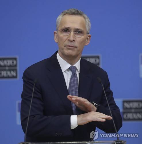 epa09680428 NATO Secretary General Jens Stoltenberg gives a press conference at the end of NATO-Russia Council at the Alliance's headquarters in Brussels, Belgium , 12 January 2022. EPA/ OLIVIER HOSLET