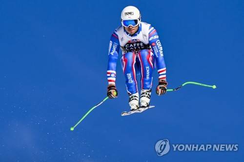epa09680447 Johan Clarey of France in action during a training session of the men's downhill race at the Alpine Skiing FIS Ski World Cup event in Wengen, Switzerland, 12 January 2022. EPA/JEAN-CHRISTOPHE BOTT