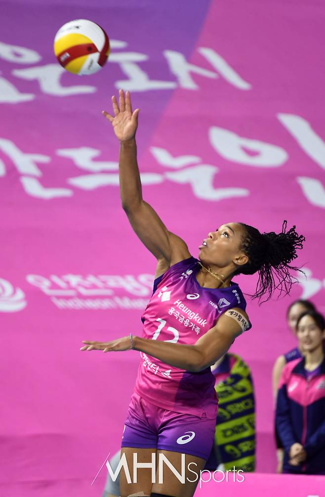 흥국생명 캣벨이 공격을 시도하고 있다.