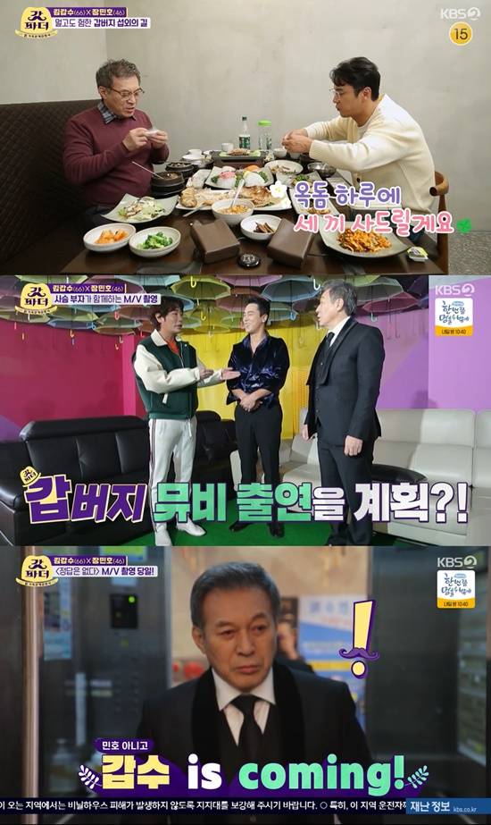 이날 방송에서는 장민호가 김갑수에게 신곡 '정답은 없다' 뮤직비디오에 출연해달라고 부탁했다.
