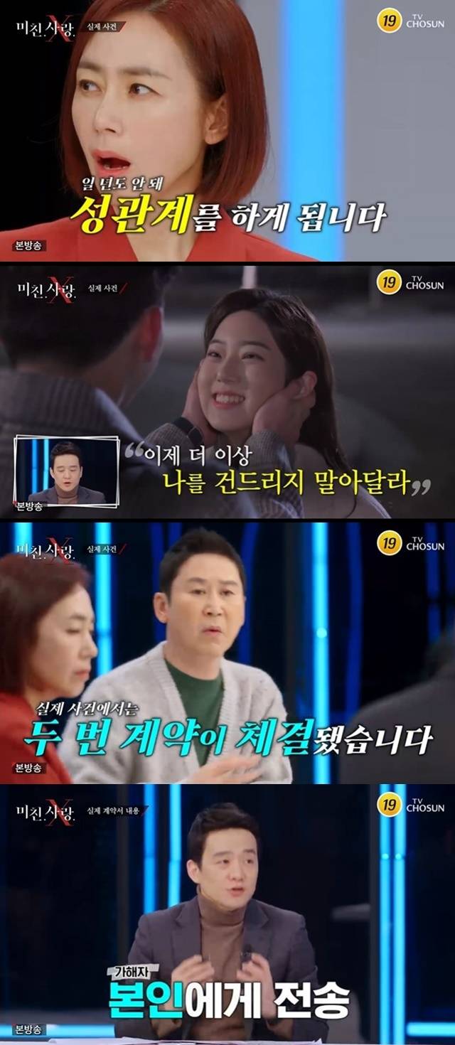 1월 12일 방송된 TV조선 '미친.사랑.X'에서는 '계약관계'라는 제목의 영상이 공개됐다. 이모부와 성노예 계약서를 작성한 조카의 사연이었다.