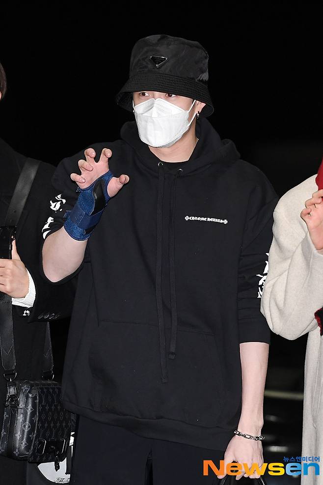 스트레이 키즈(Stray Kids) 멤버 창빈, 현진, 한, 방찬, 필릭스, 승민, 리노, 아이엔이 1월 12일 오후 인천 중구 운서동 인천국제공항 제 1여객터미널을 통해 두바이에서 열리는 두바이 엑스포 한국관 한국의 날 케이팝 콘서트 일정에 참석하기 위해 두바이로 출국하고 있다.