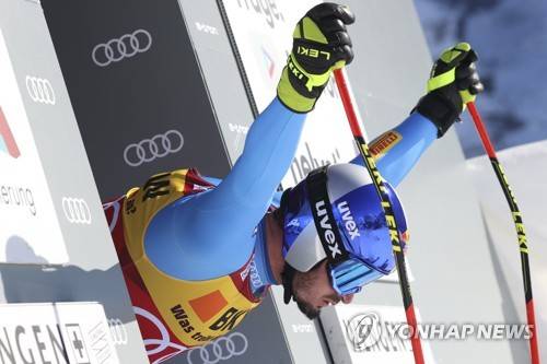 Italy's Dominik Paris prepares to speed down the course during an alpine ski, men's World Cup downhill training, in Wengen, Switzerland, Wednesday, Jan. 12, 2022. (AP Photo/Luciano Bisi)
