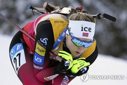 Marte Olsbu Roeiseland of Norway competes during the women's 7.5km sprint race at the biathlon World Cup in Ruhpolding, Germany, Wednesday, Jan. 12, 2022. (AP Photo/Matthias Schrader)