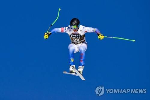 epa09680536 Erik Arvidsson of the United States in action during a training session of the men's downhill race at the Alpine Skiing FIS Ski World Cup event in Wengen, Switzerland, 12 January 2022. EPA/JEAN-CHRISTOPHE BOTT