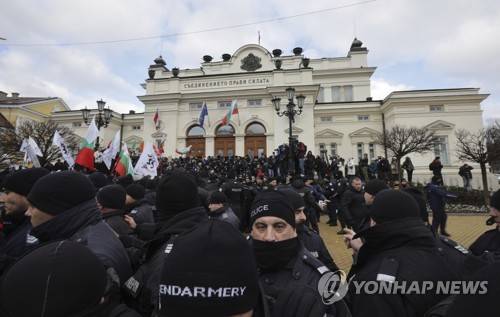 Police officers line up as they try to keep protesters away from the Bulgarian Parliament building in Sofia, Wednesday, Jan. 12, 2022. Protesters opposing COVID-19 restrictions in Bulgaria have clashed with police as they were trying to storm the Parliament in Sofia. Heavy police presence prevented protesters from entering the building and some were detained. (AP Photo/Valentina Petrova)
