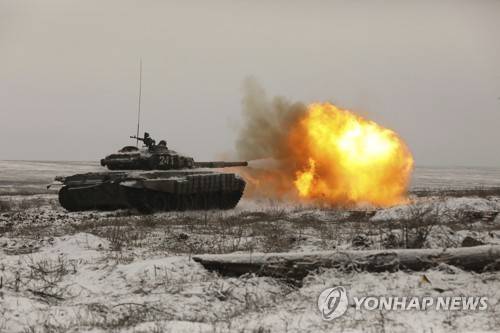 A Russian tank T-72B3 fires as troops take part in drills at the Kadamovskiy firing range in the Rostov region in southern Russia, Wednesday, Jan. 12, 2022. Russia has rejected Western complaints about its troop buildup near Ukraine, saying it deploys them wherever it deems necessary on its own territory. (AP Photo)