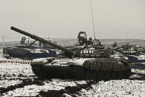 Russian tanks T-72B3 take part in drills at the Kadamovskiy firing range in the Rostov region in southern Russia, Wednesday, Jan. 12, 2022. Russia has rejected Western complaints about its troop buildup near Ukraine, saying it deploys them wherever it deems necessary on its own territory. (AP Photo)