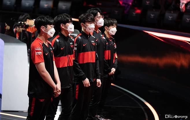 T1은 12일 오후 서울 종로구 그랑서울 롤파크에서 열린 2022 LCK 스프링 개막전 광동 프릭스와의 경기서 2대0으로 승리했다. 경기 후 팬들에게 인사 준비하는 T1 선수단.
