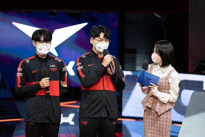 T1은 12일 오후 서울 종로구 그랑서울 롤파크에서 열린 2022 LCK 스프링 개막전 광동 프릭스와의 경기서 2대0으로 승리했다. 경기 후 '오너' 문현준, '구마유시' 이민형이 인터뷰를 하고 있다.