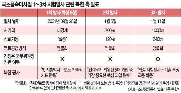 특히 북한은 지난 11일 있었던 극초음속미사일 시험발사를 '최종 시험발사'라고 12일 밝힌 것과 관련해 탄두부인 극초음속 활공체의 성능을 확인하는 마무리 단계에 접어들었다는 분석이 제기된다.