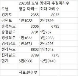 국립생물자원관이 지난해 2월 발간한 ‘2020년 야생동물 실태조사 보고서’를 보면, 전국적으로 5만8968마리(최대 12만9140마리)의 멧돼지가 남은 것으로 추정됩니다. 아프리카돼지열병 발생 전인 2018년 9만9420마리(최대 17만7451마리)에 견줘 40%가량 개체수가 줄었습니다. (국립생물자원관이 해마다 실태조사를 하는데 해당 연도에 조사한 보고서는 다음해 2~3월 발간돼 2020년 보고서가 가장 최근 자료라고 합니다.)