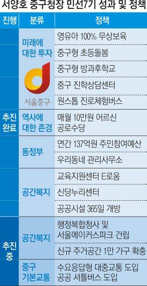 서양호 서울 중구청장은 민선7기 동안 초등돌봄, 공로수당, 동(洞)정부 등 '소프트웨어' 정책에서 성과를 냈으니, 앞으로는 생활 사회간접자본(SOC), 주택 등 '하드웨어' 정책을 통해 '공간복지'를 실현하겠다고 10일 밝혔다.