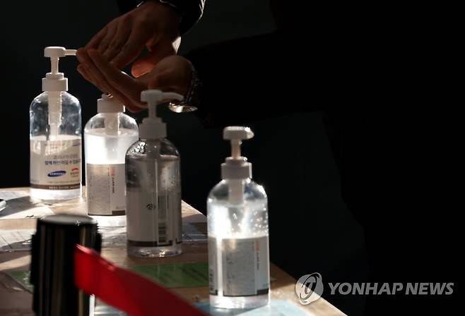 (서울=연합뉴스) 홍해인 기자 = 13일 오전 서울역 광장 중구 코로나19 임시 선별검사소를 찾은 시민이 검사에 앞서 손소독을 하고 있다.