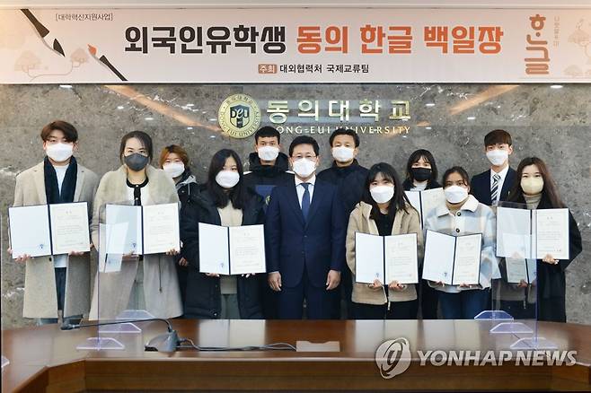 (부산=연합뉴스) 동의대는 12일 대학 본관에서 '외국인 유학생 동의 한글 백일장 시상식'을 열었다고 13일 밝혔다. 사진은 시상식 모습. 동의대는 심사를 거쳐 모두 16명을 시상했다. [동의대 제공. 재판매 및 DB 금지] 2022.1.13