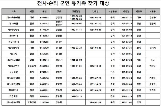 국민권익위원회와 국가보훈처, 육군본부는 13일부터 6·25전쟁부터 1986년까지 육군 재심의 후 전사·순직이 결정됐으나 유가족에게 통보되지 못한 군인 명단을 공개했다. 명단에는 소속·군번, 이름, 생년월일, 지역 등이 포함돼 있다.