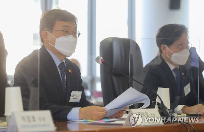 (서울=연합뉴스) 류효림 기자 = 권덕철 보건복지부 장관이 13일 오전 서울 서초구 대한무역투자진흥공사(KOTRA)에서 열린 보건복지부-산업통상자원부 공동 주재 백신·원부자재 기업투자 촉진회의 및 제1차 10대 유관기관장 협의체 협력회의에서 인사말을 하고 있다. 2022.1.13