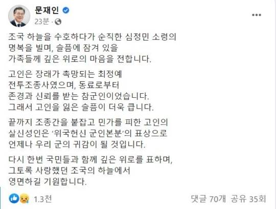 문 대통령은 13일 SNS에 "조국 하늘을 수호하다가 순직한 심정민 소령의 명복을 빌며, 슬픔에 잠겨 있을 가족들께 깊은 위로의 마음을 전한다"고 남겼다.