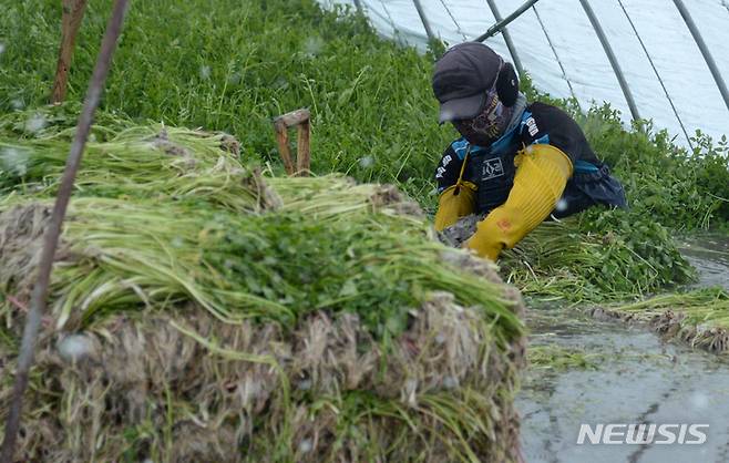 [전주=뉴시스] 김얼 기자 = 쌀쌀한 겨울 날씨가 이어지고 있는 13일 전북 전주시 덕진구 전미동에 위치한 미나리 농장에서 관계자가 미나리를 수확하고 있다. 2022.01.13. pmkeul@nwsis.com