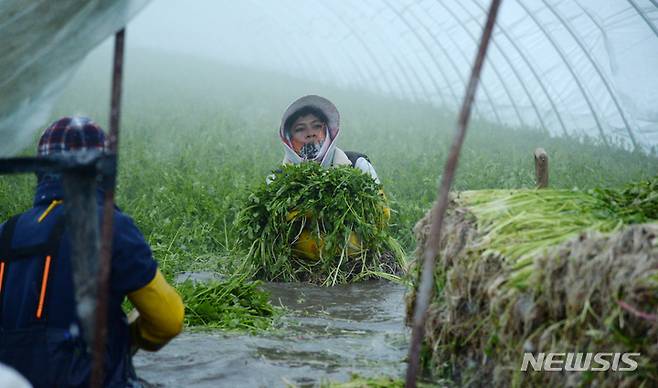 [전주=뉴시스] 김얼 기자 = 쌀쌀한 겨울 날씨가 이어지고 있는 13일 전북 전주시 덕진구 전미동에 위치한 미나리 농장에서 관계자들이 미나리를 수확하고 있다. 2022.01.13. pmkeul@nwsis.com