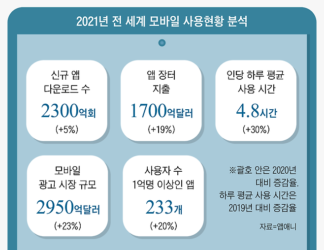 사용자 1억명 이상의 슈퍼앱도 우후죽순 탄생했다. 작년 한해 사용자 1억명 이상인 앱은 1년 전보다 20% 늘어난 233개였다. 이중 75%가 게임이었다. 늘어난 사용자를 겨냥한 모바일 광고 시장도 뜨거웠다. 작년 모바일 광고 시장 규모는 1년 전보다 23% 증가했다.
