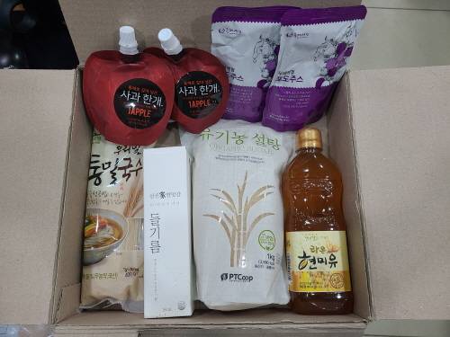 국내산 현미로 짠 식용유, 국내산 들깨로 짠 들기름, 유기농 설탕, 우리 밀로 만든 소면 등 총 6종 8개 품목을 배송비 포함 공동구매가 3만 3천에 제공한다.