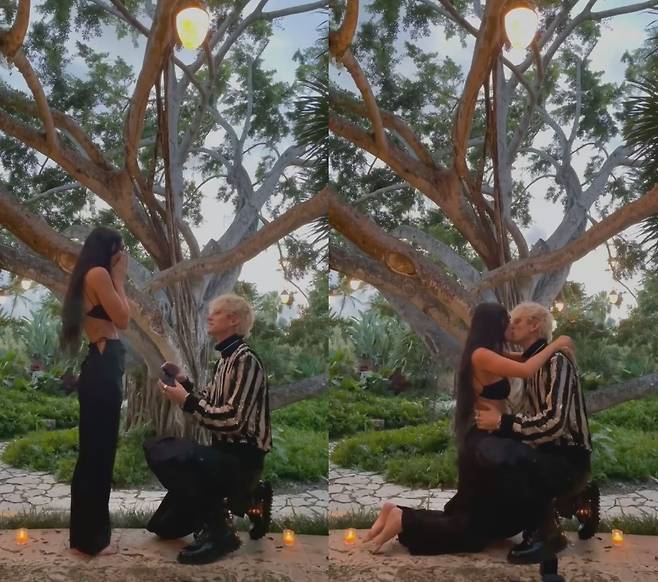 공개된 영상에는 메간 폭스가 머신건 켈리의 청혼을 받아들인 뒤 서로 키스하는 모습이 담겼다. 머신건 켈리 또한 자신의 인스타그램에 반지를 낀 메간 폭스의 손을 담은 뒤 "하나의 반지가 전통이라는 것을 알지만, 나는 스테판 웹스터와 함께 두 개의 에메랄드(그녀의 탄생석)와 다이아몬드(나의 탄생석)를 두 개의 자석 가시 띠에 세팅하여 사랑을 형상화했다"고 적었다.