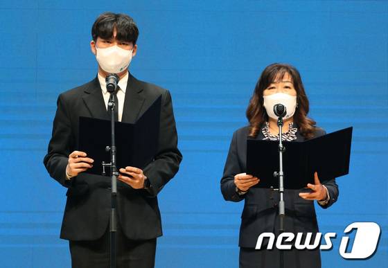 (수원=뉴스1) 김영운 기자 = 수원특례시 출범식이 열린 13일 오전 경기도 수원시 팔달구 수원시청에서 시민대표가 수원특례시 시민헌장을 발표하고 있다. 2022.1.13/뉴스1