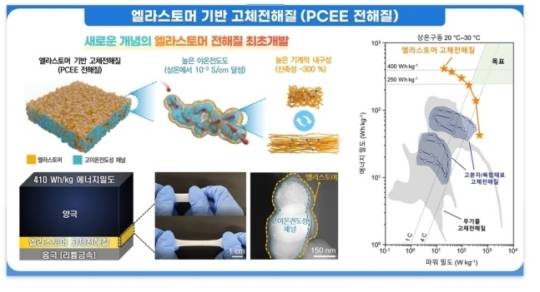 한국과학기술원(KAIST)은 13일 탄성력·복원력이 우수한 합성수지인 '엘라스토머' 형태의 고분자 전해질을 이용해 세계 최고성능의 전고체 전지를 개발했다고 밝혔다.