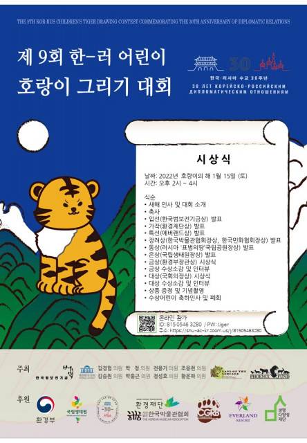 한국범보전기금이 2022년 1월 15일(토) 오후 2시 '제9회 한-러 어린이 호랑이 그리기 대회' 시상식을 줌으로 개최한다고 13일 밝혔다.