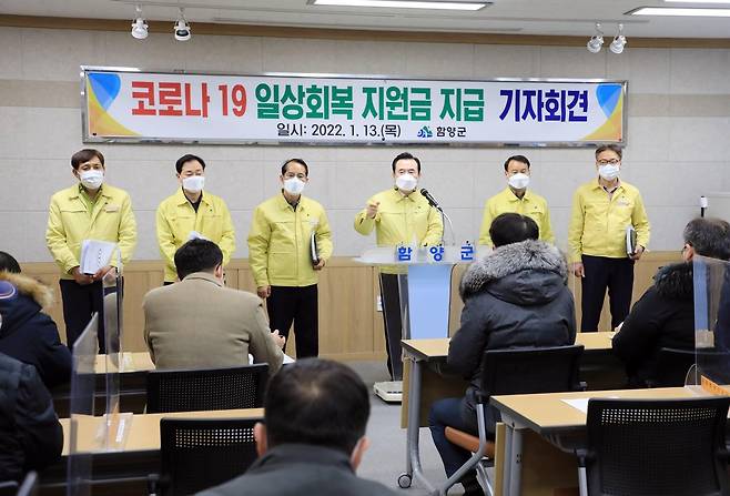(함양=연합뉴스) 서춘수 경남 함양군수가 13일 군청 소회의실에서 '코로나19 일상 회복 지원금' 관련 지원계획을 발표하고 있다. 2022.1.13