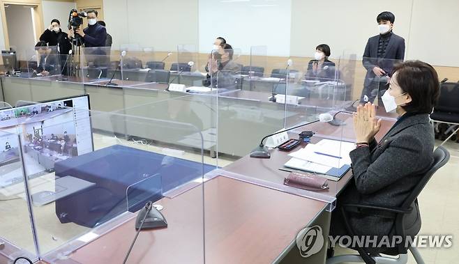 (서울=연합뉴스) 김승두 기자 = 유은혜 사회부총리 겸 교육부 장관이 13일 정부서울청사에서 전국시도교육감협의회장 등이 참석해 열린 제3차 교육회복지원위원회에서 박수치고 있다. 2022.1.13