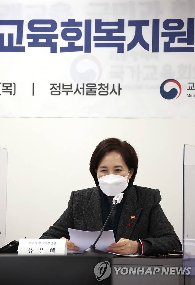 (서울=연합뉴스) 김승두 기자 = 유은혜 사회부총리 겸 교육부 장관이 13일 정부서울청사에서 전국시도교육감협의회장 등이 참석해 열린 제3차 교육회복지원위원회에서 인사말을 하고 있다. 2022.1.13