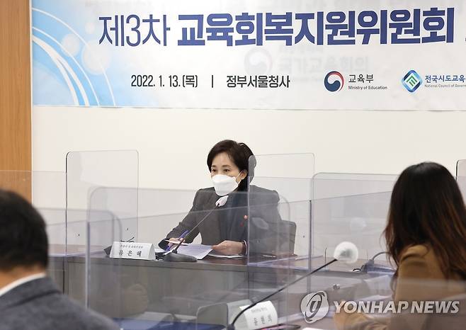 (서울=연합뉴스) 김승두 기자 = 유은혜 사회부총리 겸 교육부 장관이 13일 정부서울청사에서 전국시도교육감협의회장 등이 참석해 열린 제3차 교육회복지원위원회에서 인사말을 하고 있다. 2022.1.13