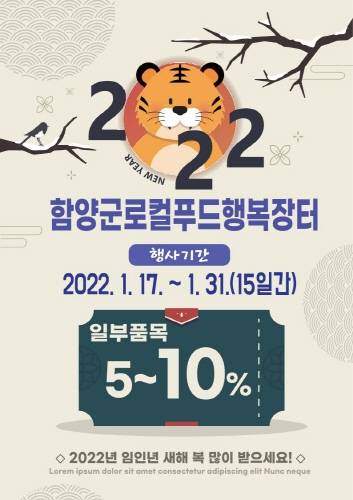 경남 함양군은 설을 앞두고 함양군 쇼핑몰과 함양군 로컬푸드 행복장터 5개소(함양휴게소 상·하행, 산삼골휴게소 상·하행, 상림공원)에서 1월 17일부터 1월 31일까지 15일간 할인행사를 실시한다.