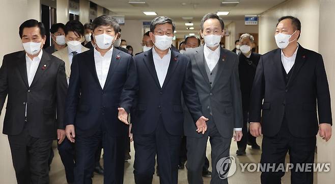 (서울=연합뉴스) 김승두 기자 = 전해철 행정안전부 장관 등이 13일 제1회 중앙지방협력회를 마치고 중앙지방협력회의 운영을 통한 중앙-지방 협력형 국정운영 방안 발표를 위해 정부서울청사 브리핑실로 이동하고 있다. 왼쪽부터 조영훈 시군자치구의장협의회장, 황명선 시장군수구청장협의회장, 전 장관, 송하진 시도지사협의회장, 김인호 시도의회의장협의회장. 2022.1.13