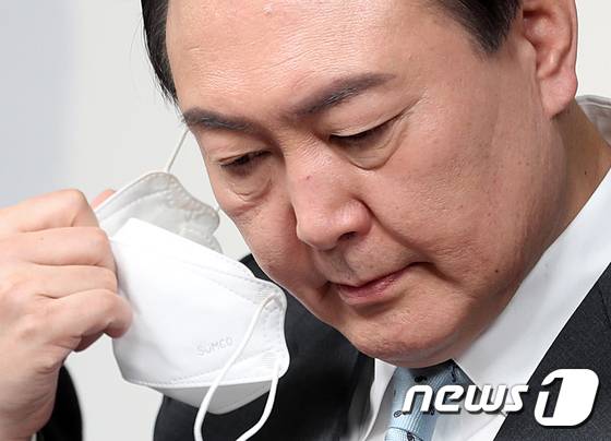 (서울=뉴스1) 오대일 기자 = 윤석열 국민의힘 대선 후보가 13일 오후 서울 영등포구 여의도 당사에서 생활밀착형 공약 행보의 일환으로 '4월 전기요금 인상 백지화' 공약을 발표하기 위해 마스크를 벗고 있다. 2022.1.13/뉴스1