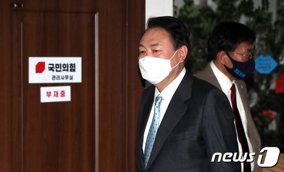 (서울=뉴스1) 오대일 기자 = 윤석열 국민의힘 대선 후보가 13일 오후 서울 여의도 국민의힘 중앙당사에서 4월 전기요금 인상 백지화 및 과학과 상식에 근거한 전력 공급 계획 수립 공약 발표 기자회견을 하기 위해 단상으로 이동하고 있다. 2022.1.13/뉴스1