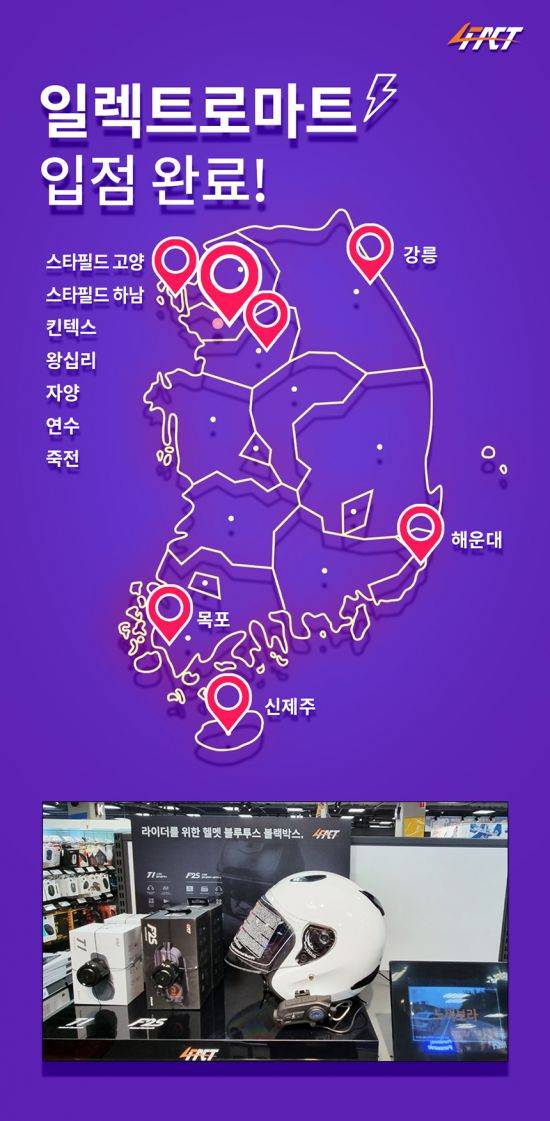 오토바이 헬멧 블루투스 전문 기업 포팩트(4FACT)가 이마트 일렉트로마트의 전국 11개 지점에 자사 제품 'T1'과 'F2S' 입점을 완료했다고 13일 밝혔다.